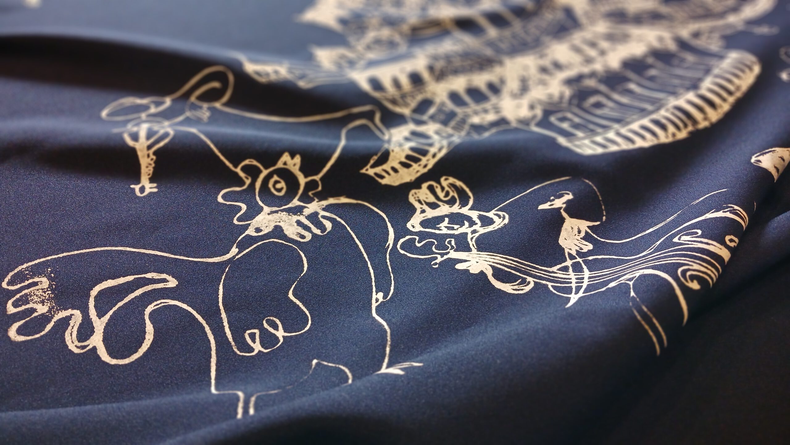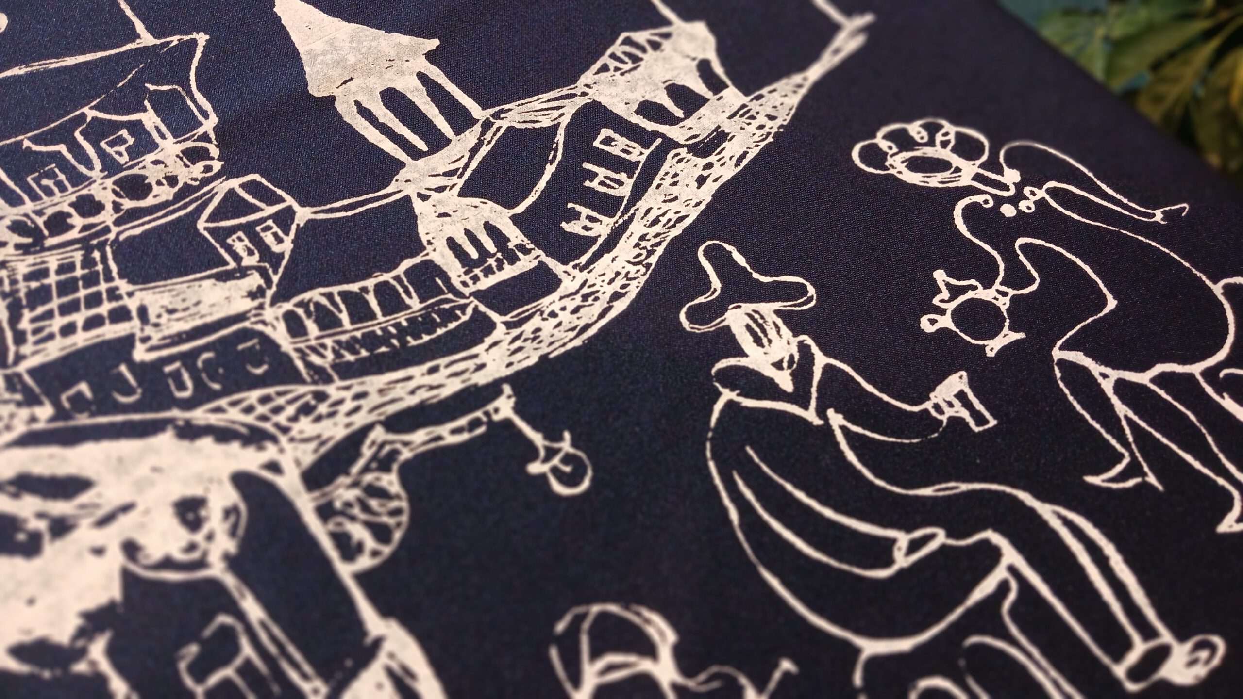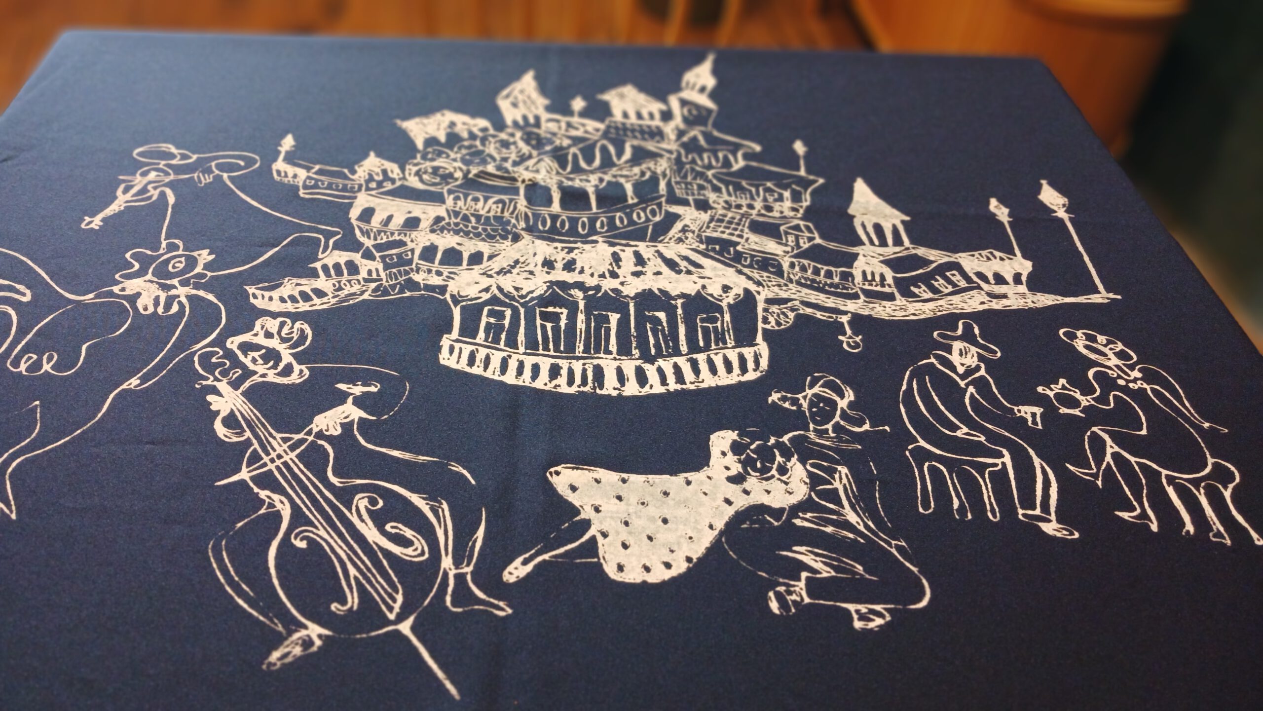 ღრმა ლურჯ ფონზე თეთრი ილუსტრაცია, რომელიც ასახავს ქალაქურ ხედსა და მხიარულ სცენას – მუსიკოსები, მოცეკვავეები და მოლხენის ატმოსფერო.