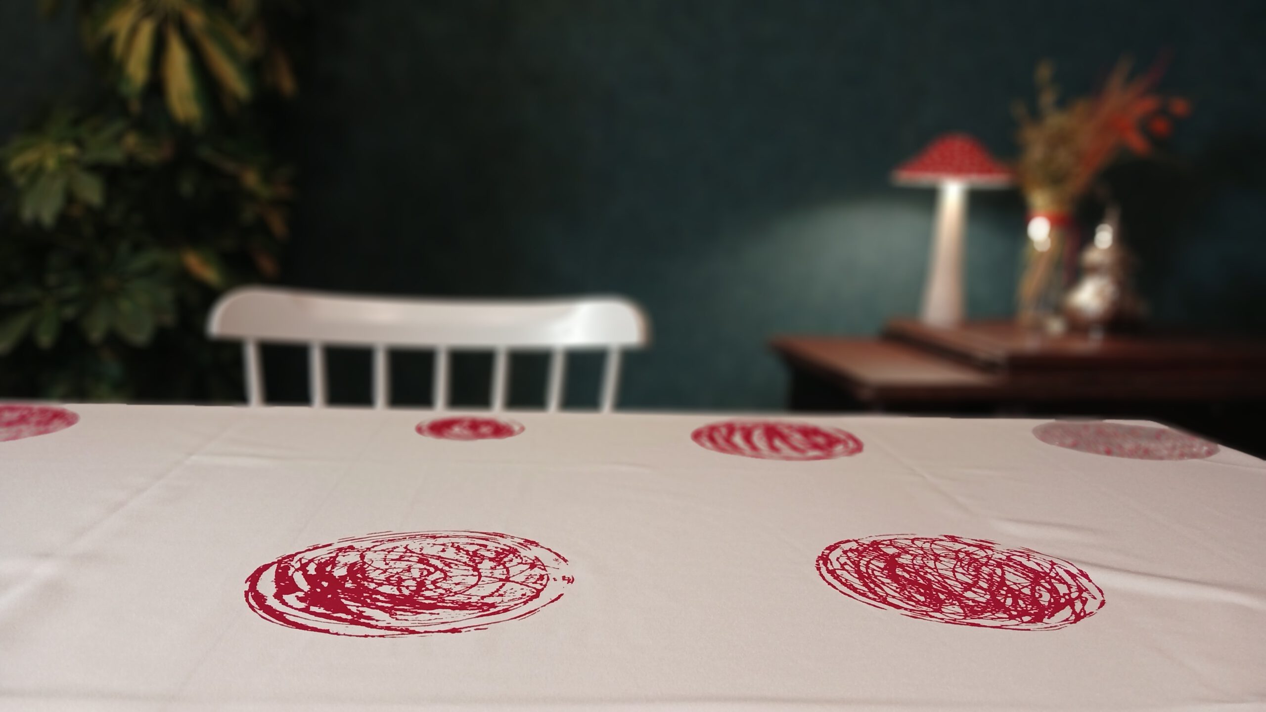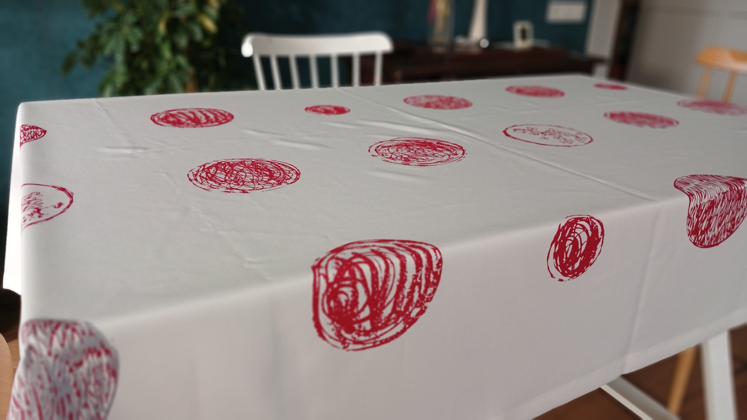 ელეგანტური, ხელნაკეთი მაგიდის სუფრა. თეთრ ქსოვილზე დატანილი წითელი წრეების უნიკალური ორნამენტი სითბოსა და ინდივიდუალურობას შემატებს თქვენს სივრცეს.